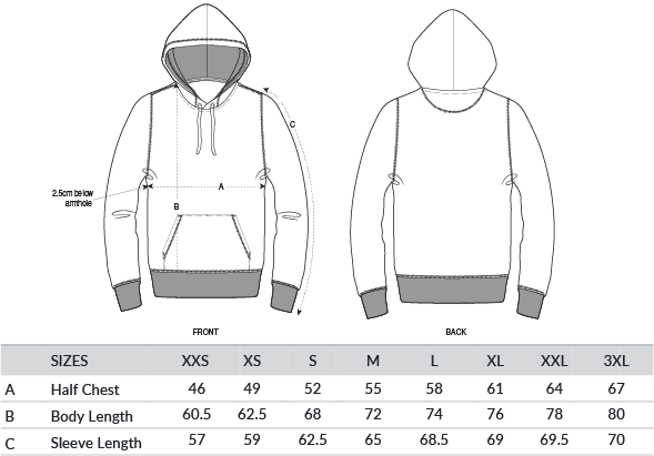 Set-in sleeve. Double-layered hood in self-fabric. Round drawcords in matching body colour with closed metal tipping. Inside herringbone back neck tape. Self-fabric half-moon at back neck. 1x1 rib at sleeve hem and bottom hem. Armhole, sleeve hem and bottom hem with twin-needle topstitch. Kangaroo pocket at front. Certified GOTS, Vegan, Fairwear, OEKO-TEX® Organic.