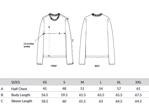 Set-in sleeve. 1x1 rib at neck collar. Narrow double-needle topstitches at sleeve cuff and hem. Inside back neck tape in self-fabric.